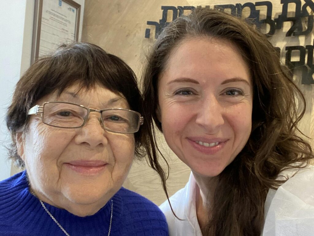 S. is a Holocaust survivor residing in Kiryat Shmona who was evacuated from her home during war. She has been staying in a nearby hotel next to our Jerusalem Dental Clinic for the past few months. She recently happened to overhear a conversation between a few of our Russian-speaking patients who had just left our clinic and struck up a conversation with them. Upon learning that our clinic provides assistance to Holocaust survivors, she expressed her need for dental care. Suffering from a dental bridge that had fallen out and requiring a deep cleaning, she was overjoyed to receive the news that we could help her. After receiving treatment, she was deeply grateful and emotional, insisting on taking a photo with the doctor and hygienist who assisted her. She has since referred other evacuees staying at the nearby hotel to HaTikva clinic for treatment.